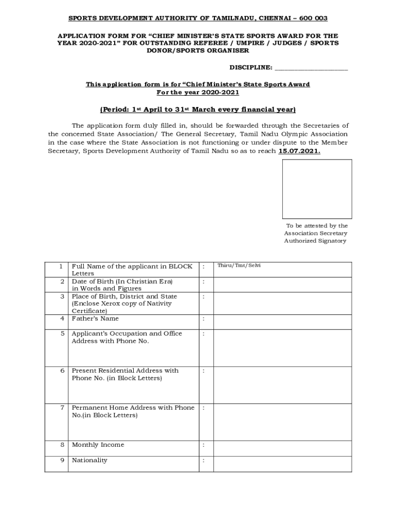 SPORTS DEVELOPMENT AUTHORITY OF Tamil Nadu, CHENNAI 600 003 APPLICATION FORM FOR CHIEF MINISTERS STATE SPORTS AWARD FOR THE YEAR 20202021 FOR OUTSTANDING REFEREE / UMPIRE / JUDGES / SPORTS DONOR/SPORTS