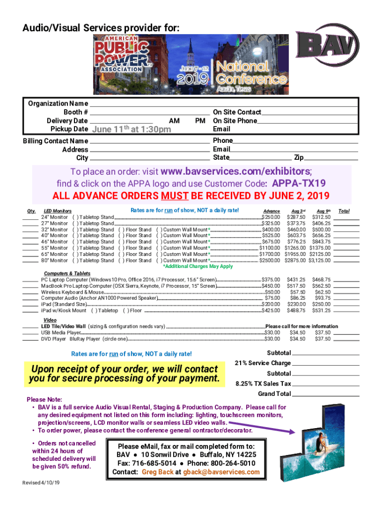 Audio/Visual Services' provider for:Organization Name Booth # Delivery Date Pickup Datamyne 11th at 1:30pmPMOn Site Contact On Site Phone Email StateBilling Contact Name Address CityZipTo place an