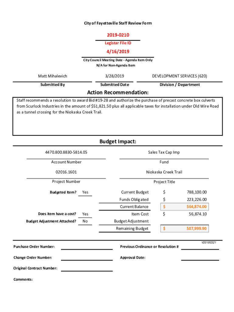CityofFayettevilleStaffReviewForm20190210 LegistarFileID4/16/2019 CityCouncilMeetingDateAgendaItemOnly N/AforNonAgendaItemMattMihalevich3/28/2019DEVELOPMENTSERVICES(620)SubmittedBySubmittedDateDivision/DepartmentActionRecommendation: