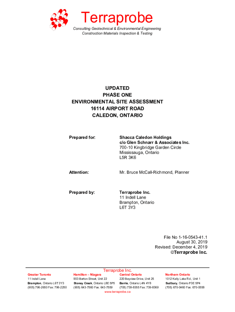 Terra probe Consulting Geotechnical & Environmental Engineering Construction Materials Inspection & TestingUPDATED PHASE ONE ENVIRONMENTAL SITE ASSESSMENT 16114 AIRPORT ROAD CALEDON, ONTARIOPrepared