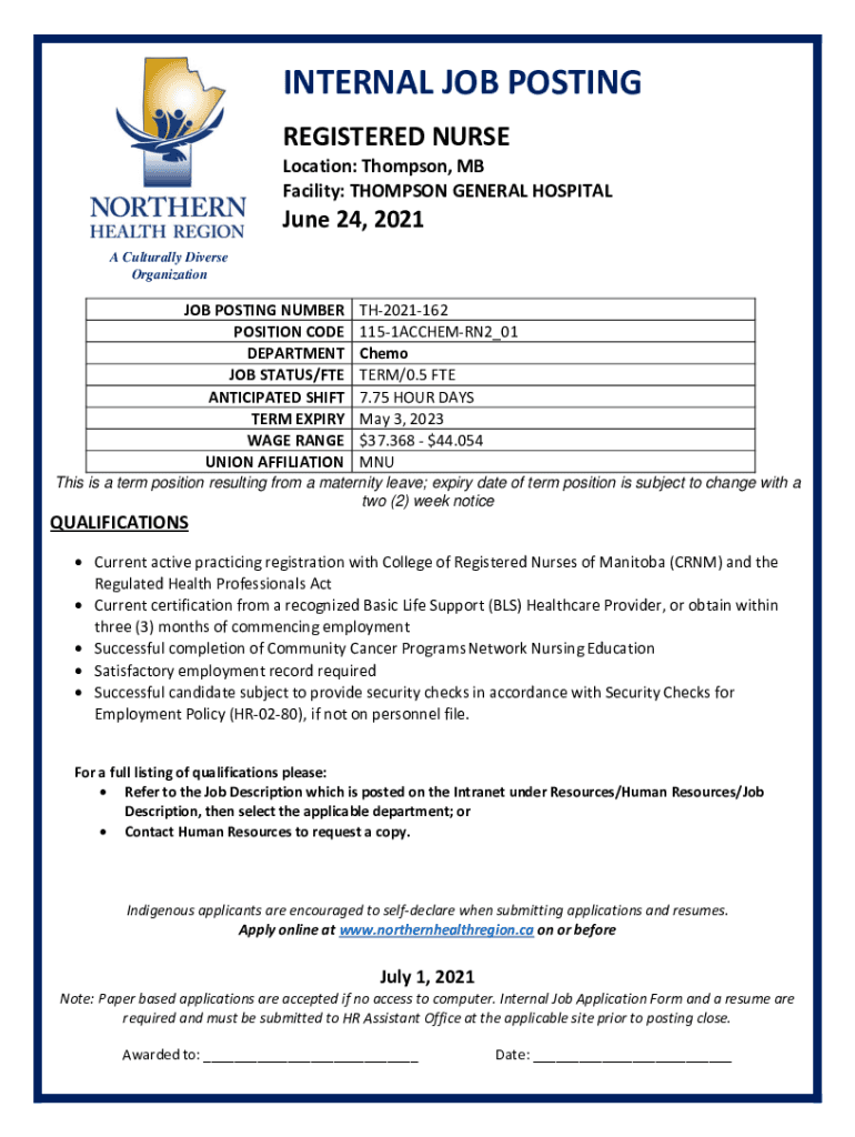 INTERNAL JOB POSTING REGISTERED NURSE Location: Thompson, MB Facility: THOMPSON GENERAL HOSPITAL June 24, 2021, A Culturally Diverse Organization POSTING NUMBER POSITION CODE DEPARTMENT JOB STATUS/FTE