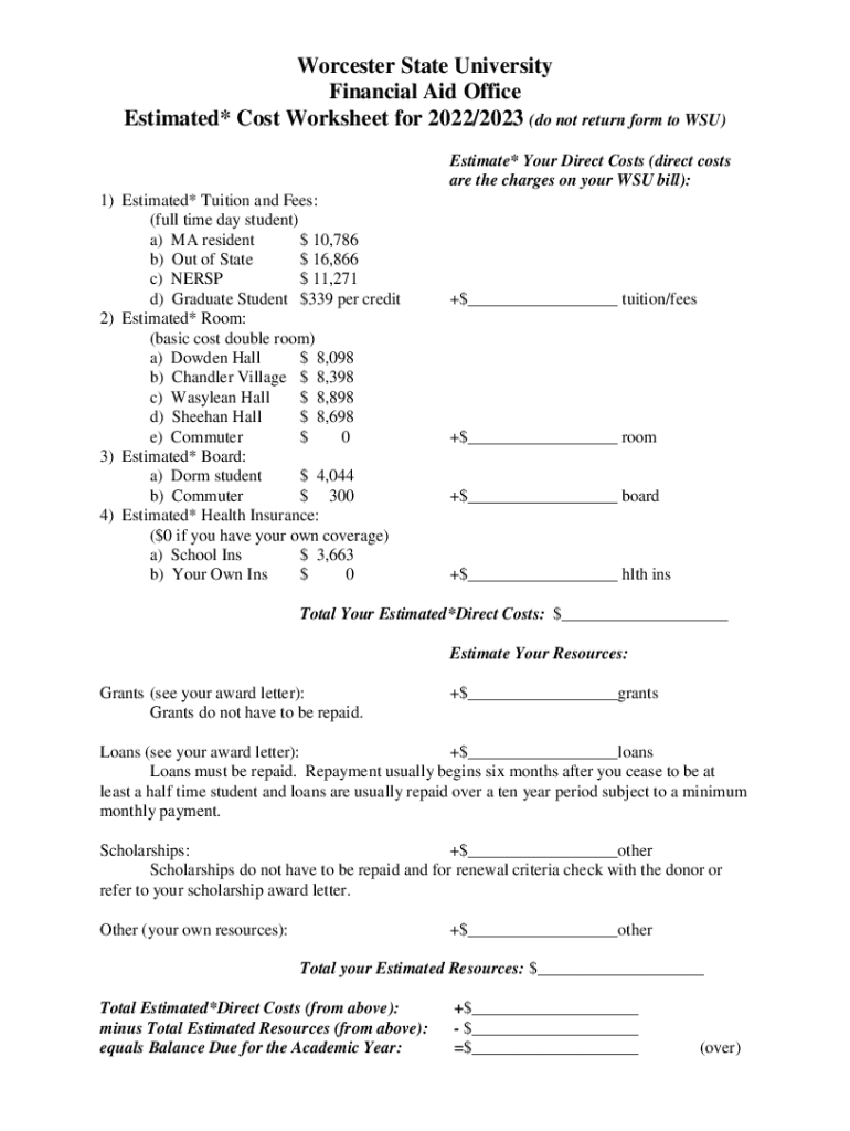 Worcester State University Financial Aid Office Estimated* Cost Worksheet for 2022/2023 (do not return form to WSU) Estimate* Your Direct Costs (direct costs are the charges on your WSU bill): 1)
