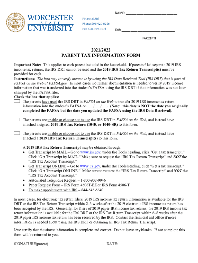 NAME: ___ Financial iPhone: 5089298056 Fax: 5089298194___ ID#: ___ FAC21PTI2021/2022 PARENT TAX INFORMATION FORM Important Note: This applies to each parent included in the household. If parents filed