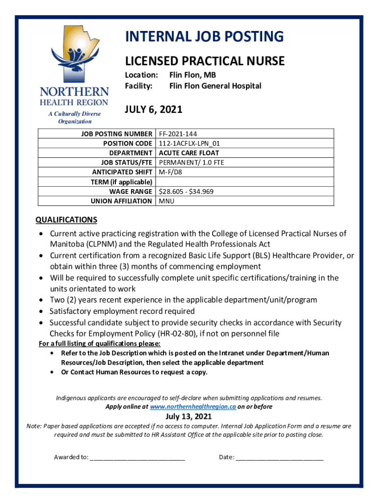 INTERNAL JOB POSTING LICENSED PRACTICAL NURSE Location: Facility: A Culturally Diverse Organizational Flow, MB Flip Flow General Hospitality 6, 2021JOB POSTING NUMBER POSITION CODE DEPARTMENT JOB