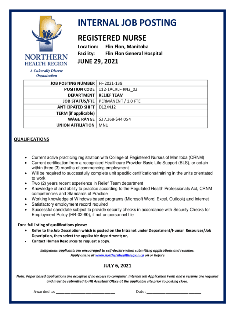 INTERNAL JOB POSTING REGISTERED NURSE Location: Facility:Flip Flow, Manitoba Flip Flow General Hospitalize 29, 2021 A Culturally Diverse Organization POSTING NUMBER POSITION CODE DEPARTMENT JOB STATUS/FTE