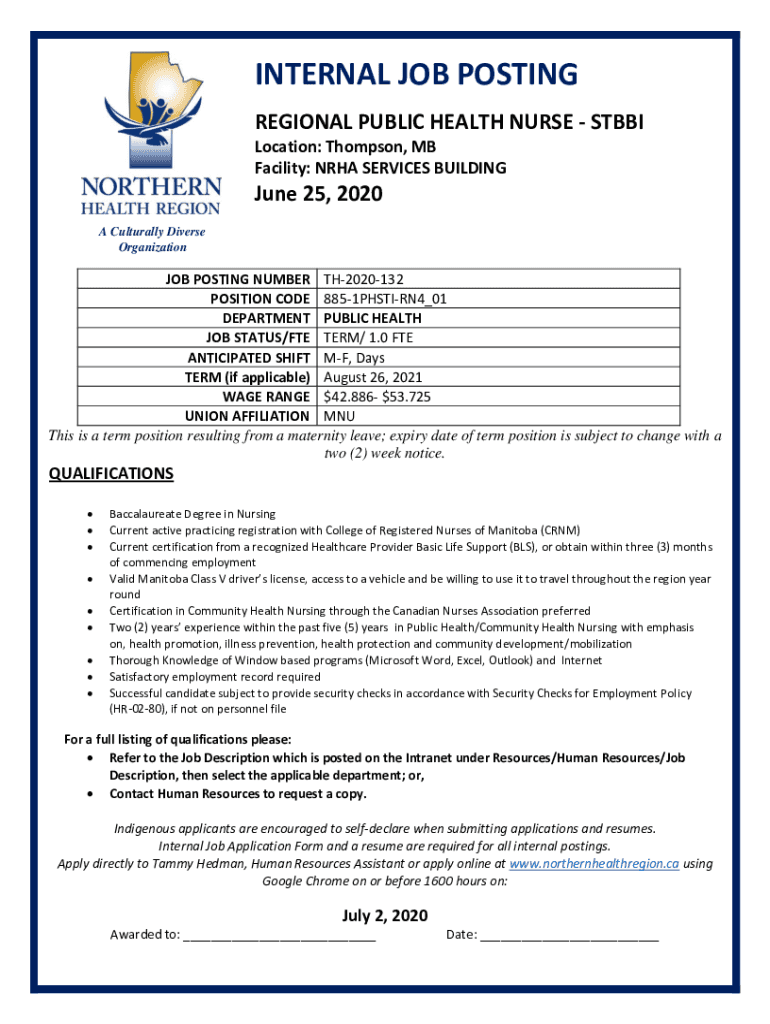 INTERNAL JOB POSTING REGIONAL PUBLIC HEALTH NURSE ST BBI Location: Thompson, MB Facility: NRA SERVICES BUILDING June 25, 2020, A Culturally Diverse Organization POSTING NUMBER TH2020132 POSITION CODE