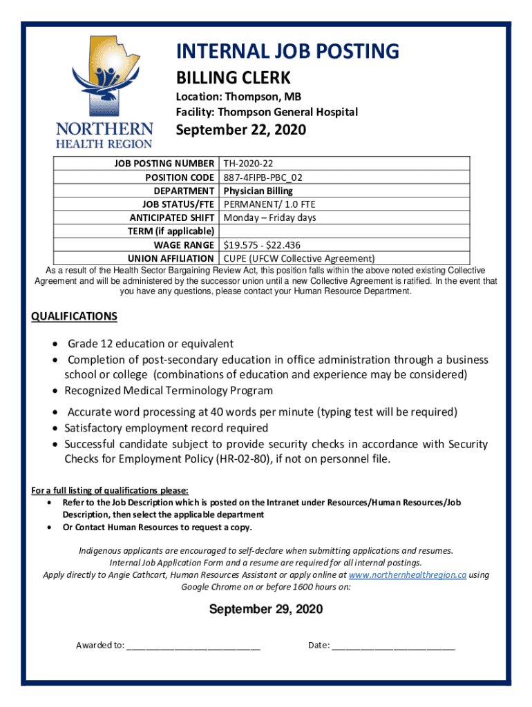 INTERNAL JOB POSTING BILLING CLERK Location: Thompson, MB Facility: Thompson General Hospital September 22, 2020, JOB POSTING NUMBER POSITION CODE DEPARTMENT JOB STATUS/FTE ANTICIPATED SHIFT TERM