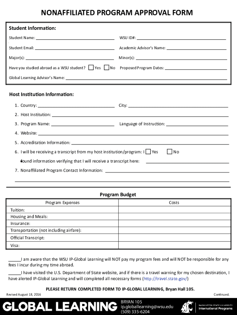 UNAFFILIATED PROGRAM APPROVAL FORM Student Information: Student Name:WSU ID#:Student Email:Academic Advisors Name:Major(s):Minor(s):Have you studied abroad as a WSU student? YesNoProposed Program