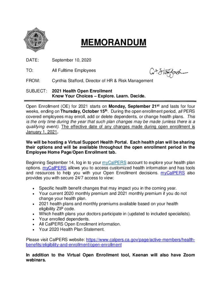 MEMORANDUM DATE:September 10, 2020TO:All Full time EmployeesFROM:Cynthia Stafford, Director of HR & Risk ManagementSUBJECT:2021 Health Open Enrollment Know Your Choices Explore. Learn. Decide. Open