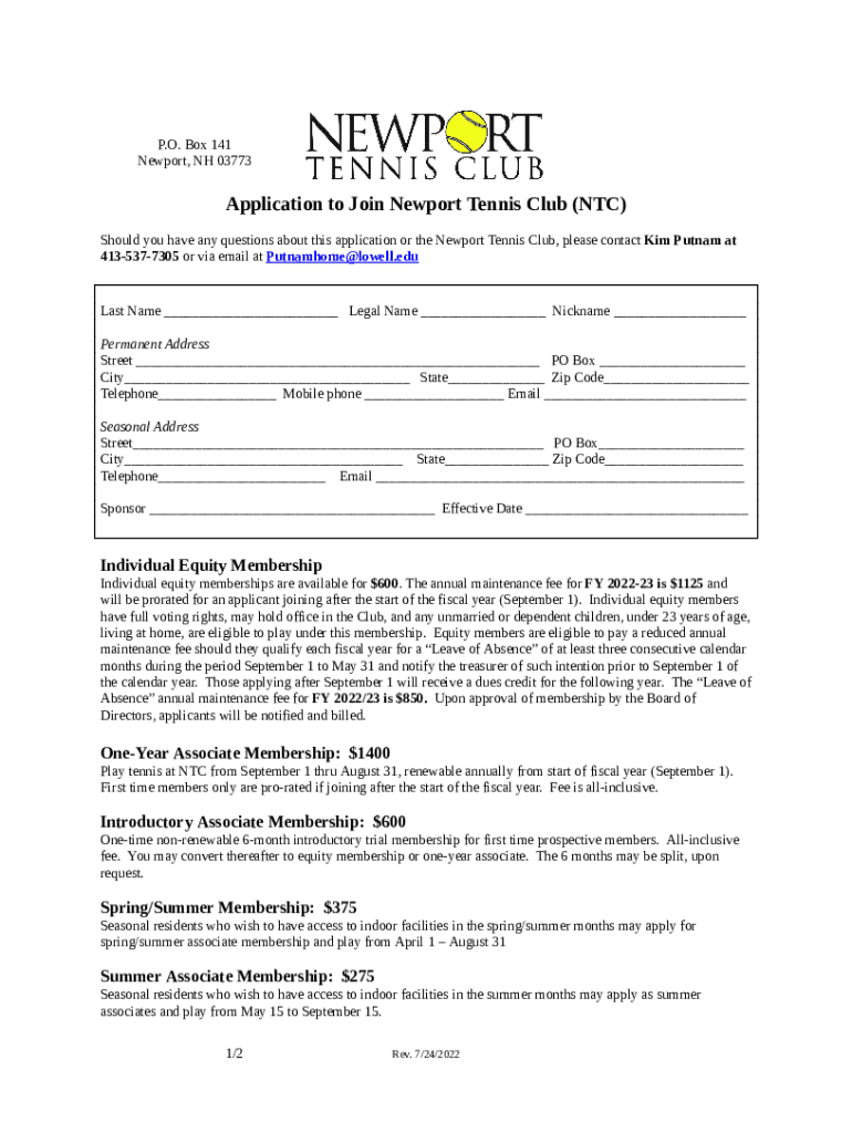 P.O. Box 141 Newport, NH 03773Application to Join Newport Tennis Club (NTC) Should you have any questions about this application or the Newport Tennis Club, please contact Kim Putnam at 4135377305