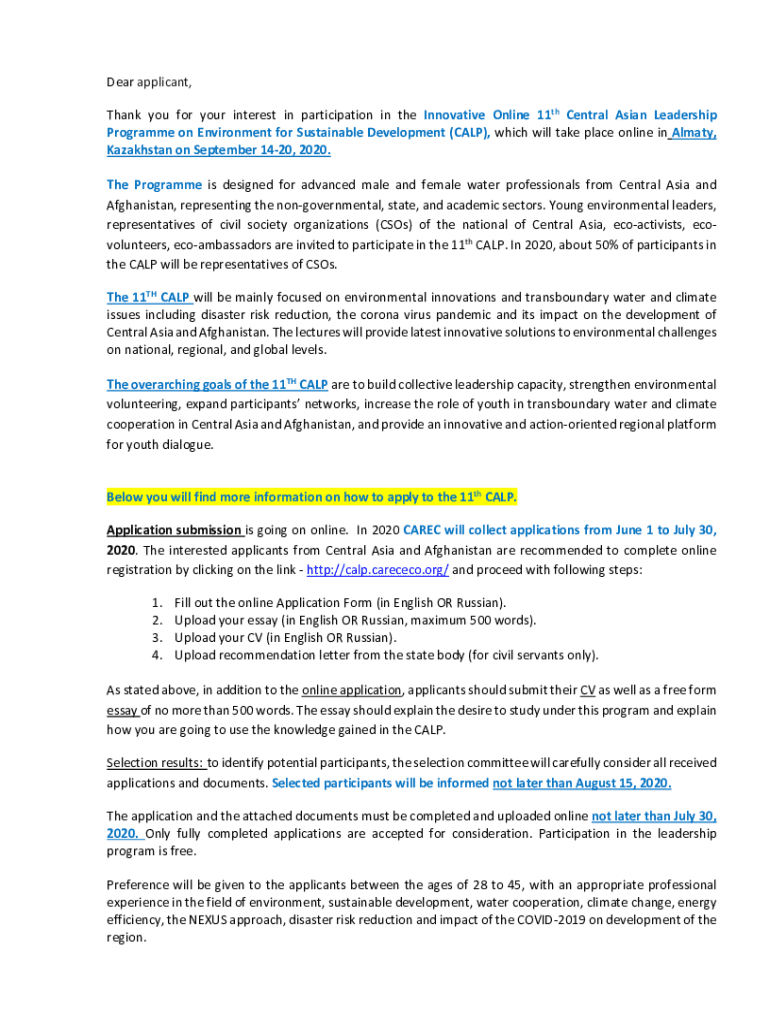 Dear applicant, Thank you for your interest in participation in the Innovative Online 11th Central Asian Leadership Program on Environment for Sustainable Development (CALL), which will take place
