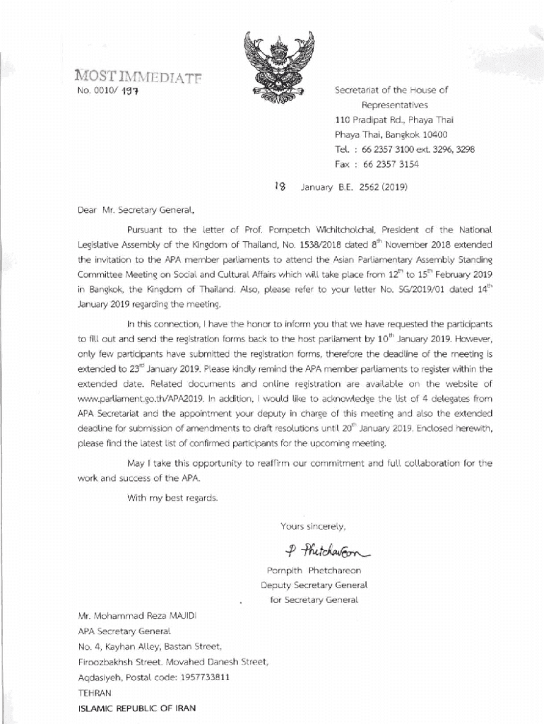 Fax : 66 2357 3154I$January B.E. 2562 (2019)Dear Mr. Secretary