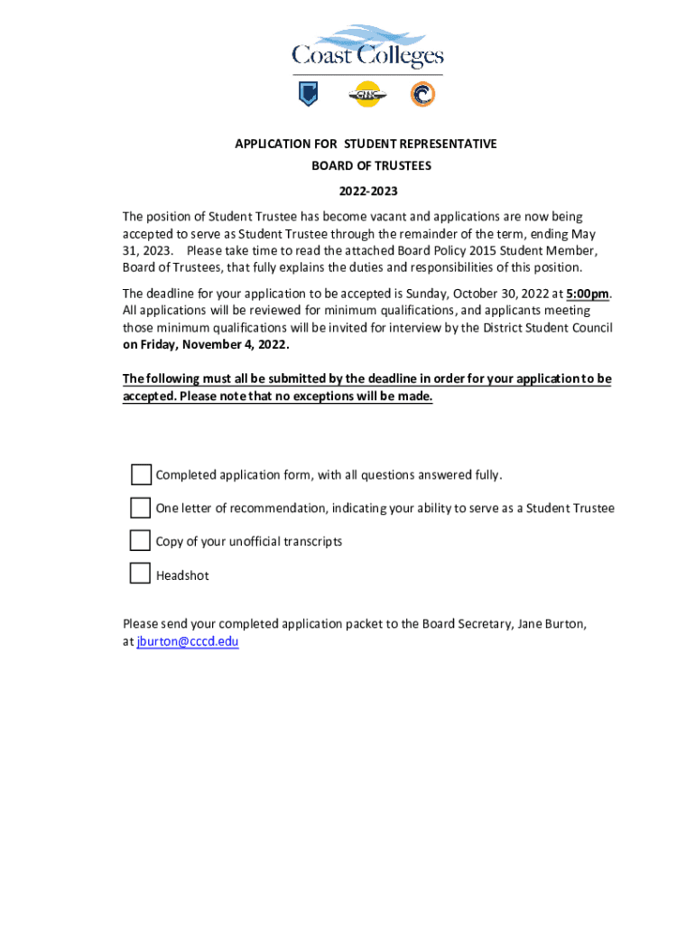 APPLICATION FOR STUDENT REPRESENTATIVE BOARD OF TRUSTEES 20222023 The position of Student Trustee has become vacant and applications are now being accepted to serve as Student Trustee through the