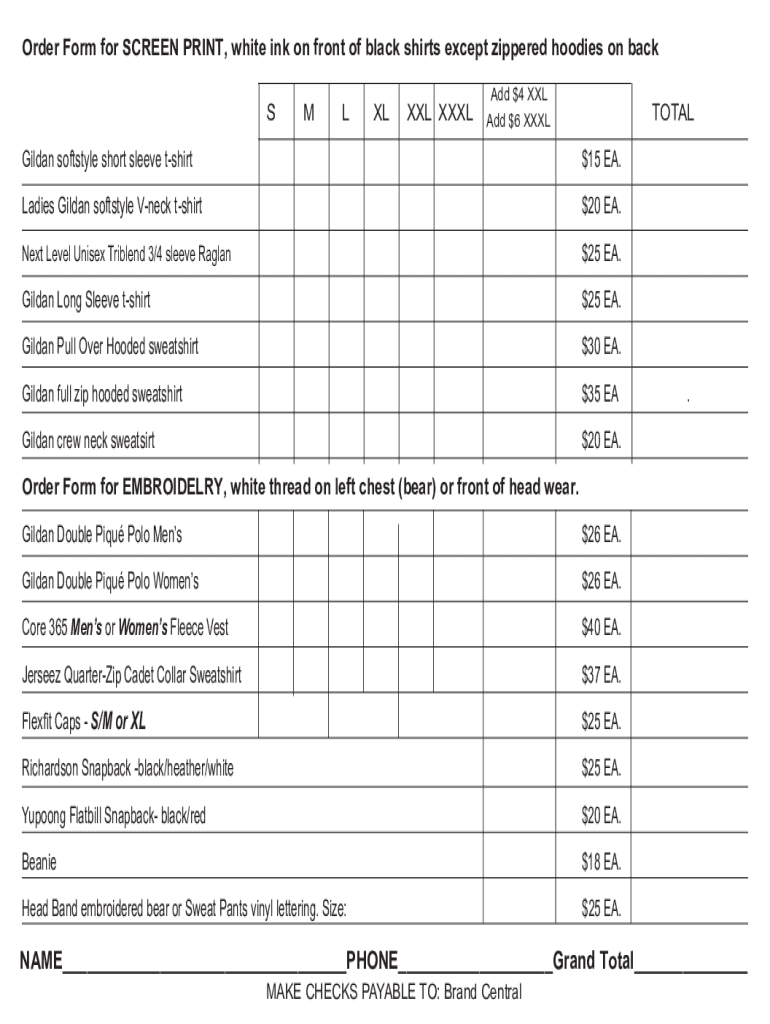 Order Form for SCREEN PRINT, white ink on front of black shirts except zippered hoodies on back Add $4 XXL M L XL XXL Add $6 XXXLTOTAL Gilda soft style short sleeve tshirt$15 EA. Ladies Gilda soft