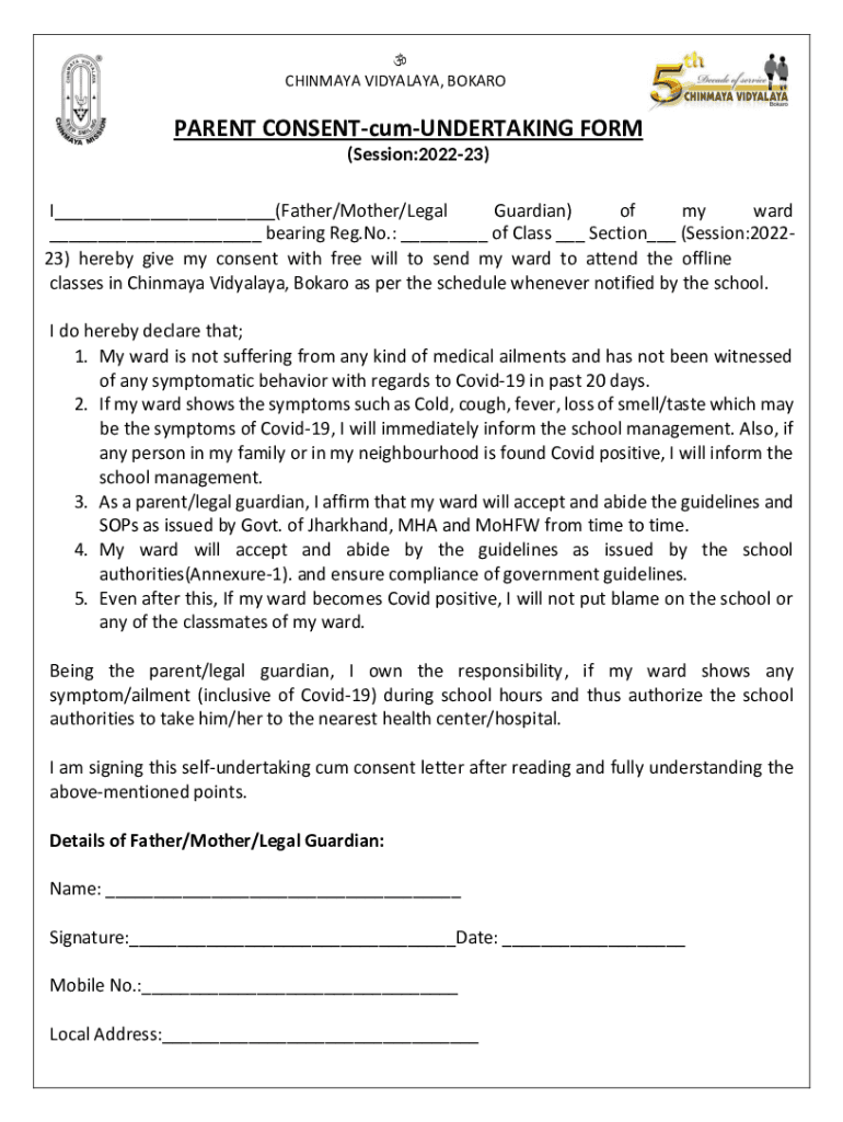 The parent consent-cum-undertaking form is a document that grants permission from a parent or guardian for a specific activity or decision.