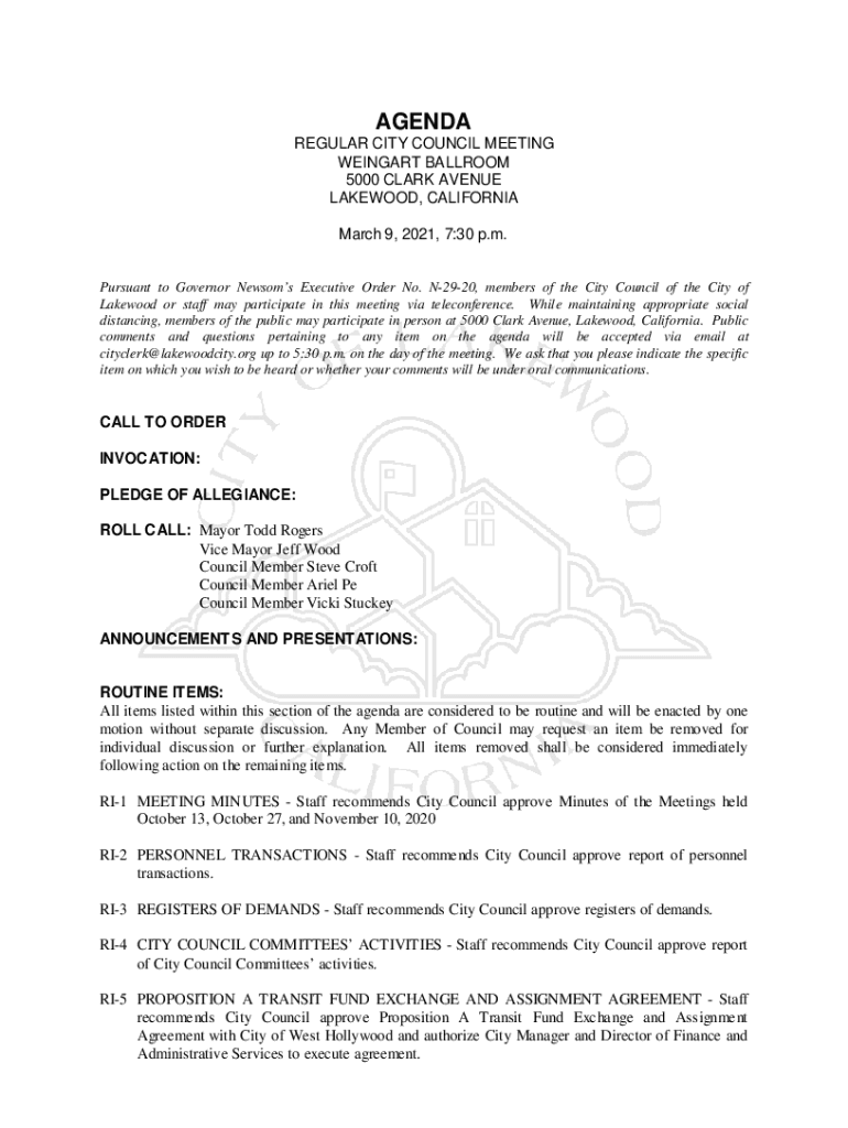 AGENDA REGULAR CITY COUNCIL MEETING REINHART BALLROOM 5000 CLARK AVENUE LAKEWOOD, CALIFORNIA March 9, 2021, 7:30 p.m. Pursuant to Governor News oms Executive Order No. N2920, members of the City Council