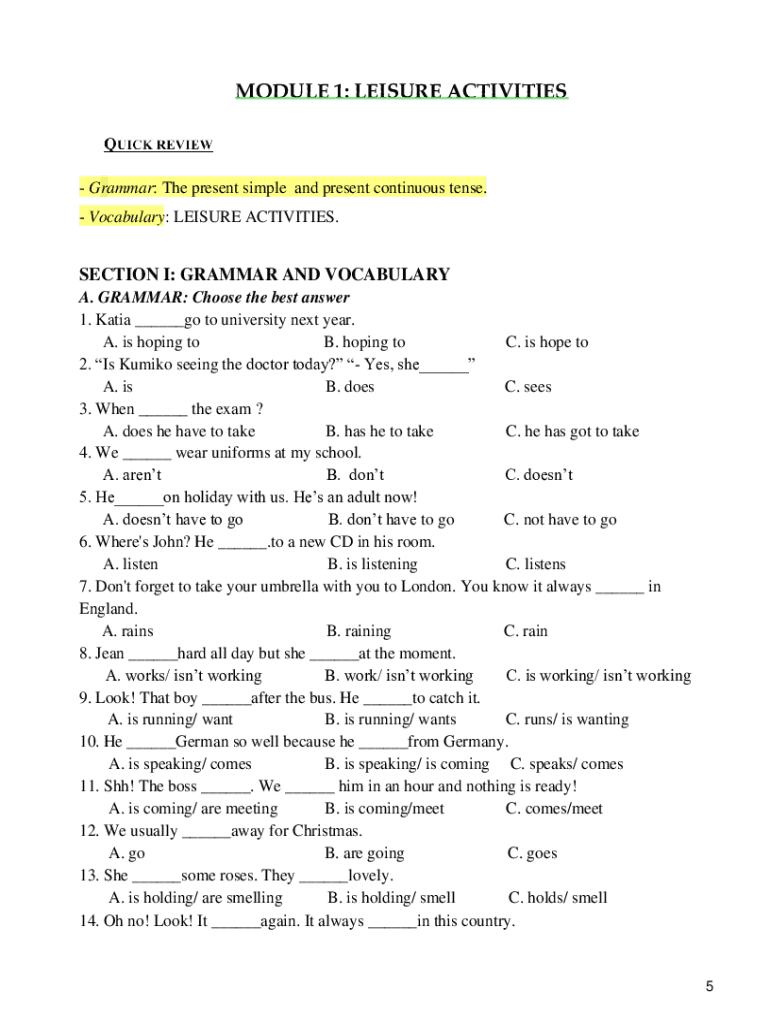 MODULE 1: LEISURE ACTIVITIES Grammar: The present simple and present continuous tense. Vocabulary: LEISURE ACTIVITIES.SECTION I: GRAMMAR AND VOCABULARY A. GRAMMAR: Choose the best answer 1. Katia