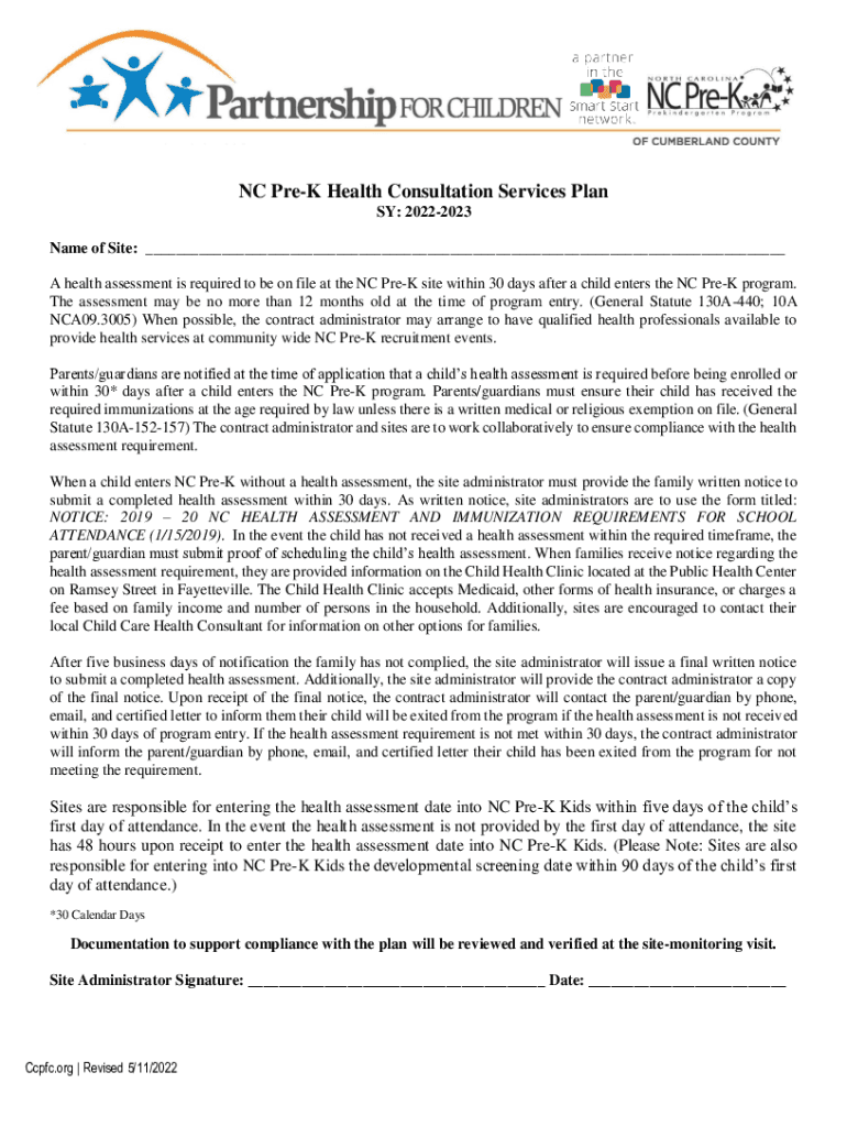 NC Prey Health Consultation Services Plan SY: 20222023 Name of Site: ___ A health assessment is required to be on file at the NC Prey site within 30 days after a child enters the NC Prey program.