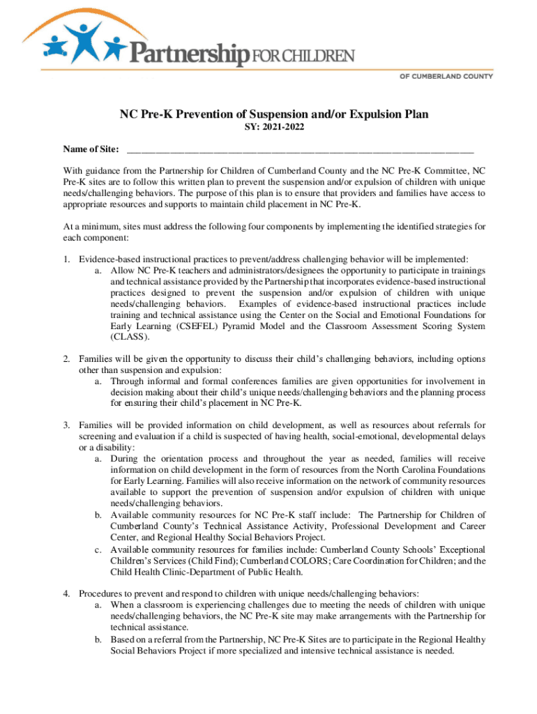 NC Prey Prevention of Suspension and/or Expulsion Plan SY: 20212022 Name of Site: ___ With guidance from the Partnership for Children of Cumberland County and the NC Prey Committee, NC Prey sites