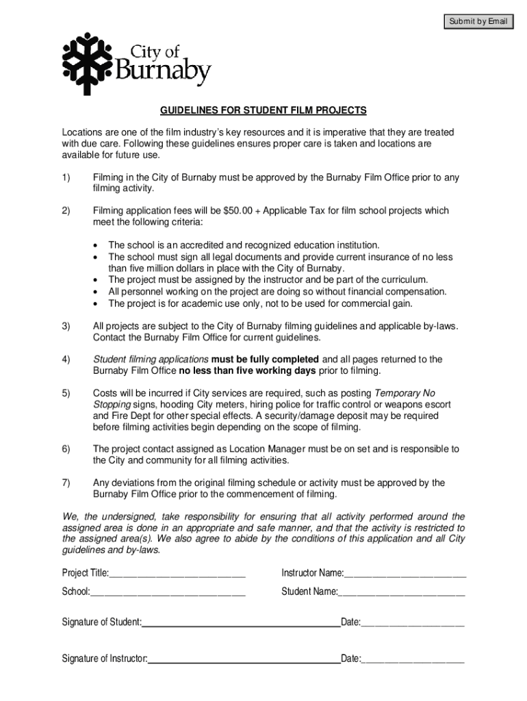 Submit by EmailGUIDELINES FOR STUDENT FILM PROJECTS Locations are one of the film industries key resources, and it is imperative that they are treated with due care. Following these guidelines ensures