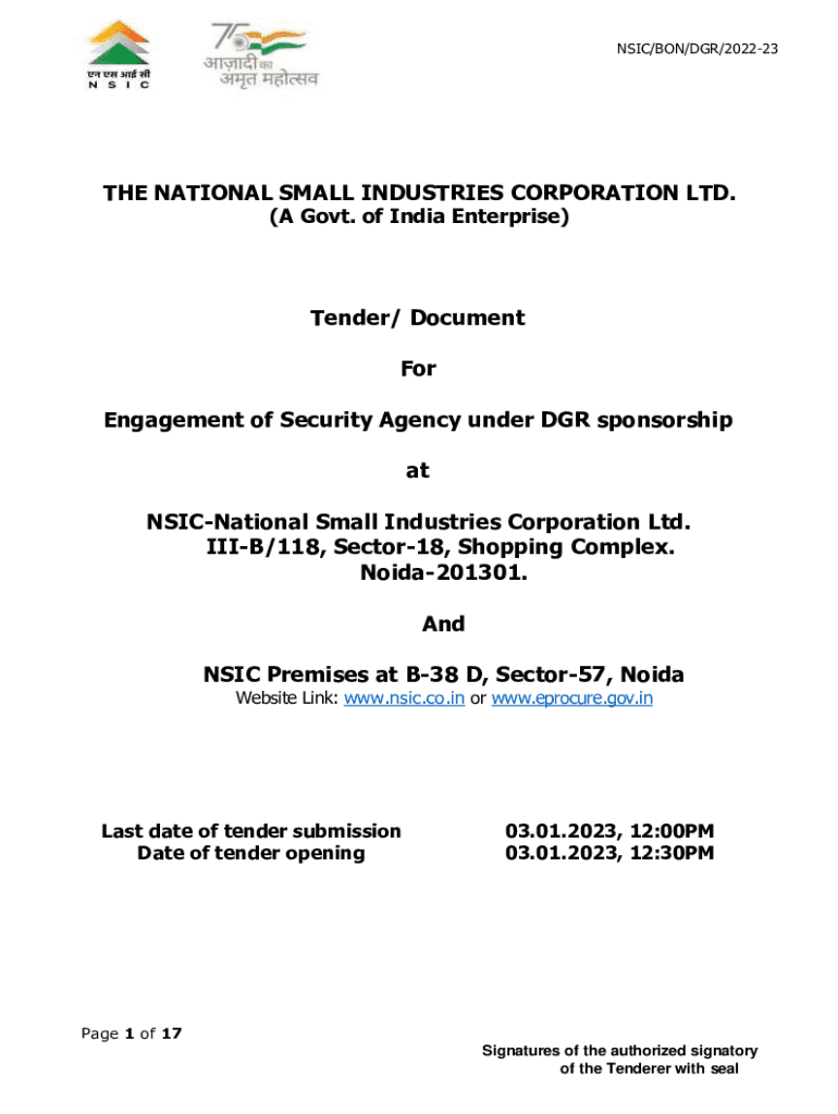 SIC/ON/DR/202223THE NATIONAL SMALL INDUSTRIES CORPORATION LTD. (A Govt. of India Enterprise)Tender/ Document For Engagement of Security Agency under DR sponsorship at Situational Small Industries