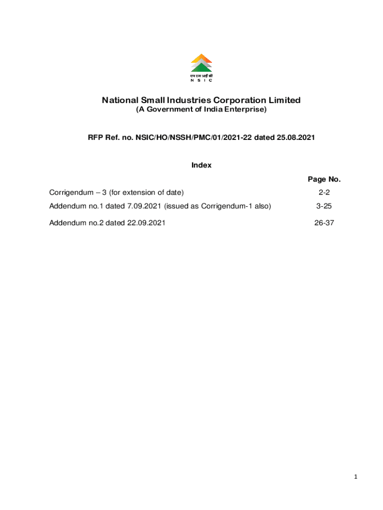 National Small Industries Corporation Limited (A Government of India Enterprise)RFP Ref. No. SIC/HO/NASH/PMC/01/202122 dated 25.08.2021Index Page No. Corrigendum 3 (for extension of date)22Addendum