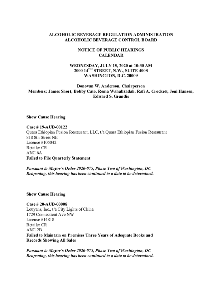 ALCOHOLIC BEVERAGE REGULATION ADMINISTRATION ALCOHOLIC BEVERAGE CONTROL BOARD NOTICE OF PUBLIC HEARINGS CALENDAR WEDNESDAY, JULY 15, 2020, at 10:30 AM 2000 14TH STREET, N.W., SUITE 400S WASHINGTON,