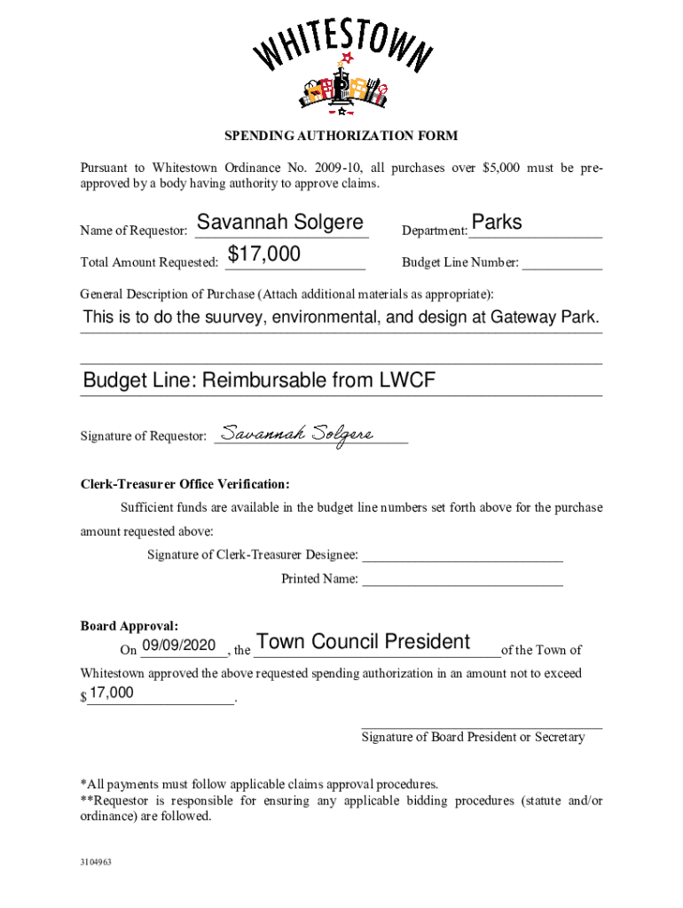 SPENDING AUTHORIZATION FORM Pursuant to Whites town Ordinance No. 200910, all purchases over $5,000 must be preapproved by a body having authority to approve claims. Savannah Soldier Name of Requestor: