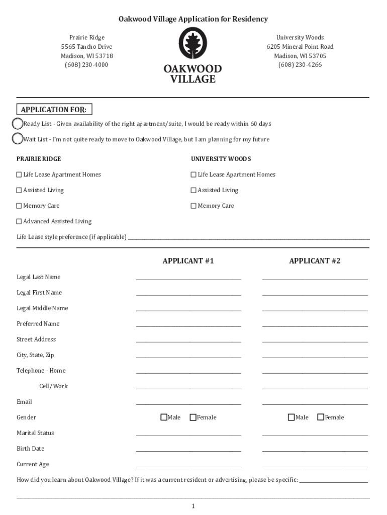 Oak wood Village Application for Residency Prairie Ridge 5565 Sancho Drive Madison, WI 53718 (608) 2304000University Woods 6205 Mineral Point Road Madison, WI 53705 (608) 2304266APPLICATION FOR: Ready