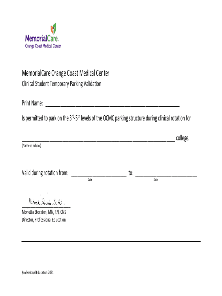 Memorialize Orange Coast Medical Center Clinical Student Temporary Parking ValidationPrint Name: ___ Is permitted to park on the 3rd5th levels of the CMC parking structure during clinical rotation