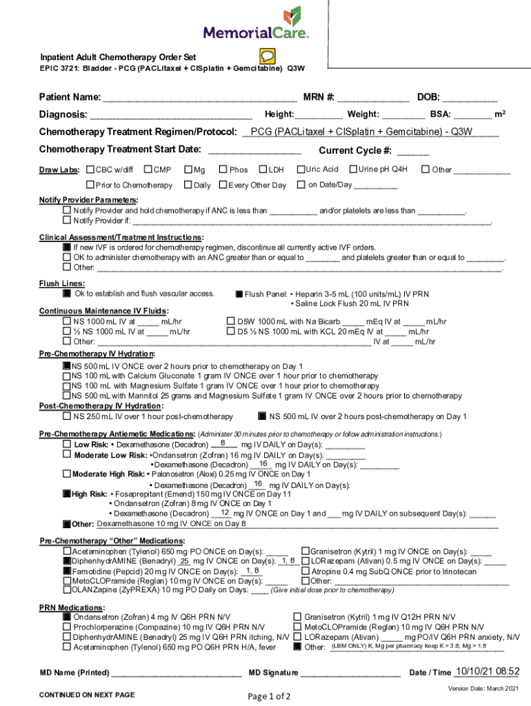 Inpatient Adult Chemotherapy Order Set EPIC 3721: Bladder PCG (+ +) Q3WPatient Name: ___ MAN #: ___ DOB: ___ Diagnosis: ___Height:___ Weight: ___ BSA: ___ m2PCG (+ +) Q3W Chemotherapy Treatment Regimen/Protocol:
