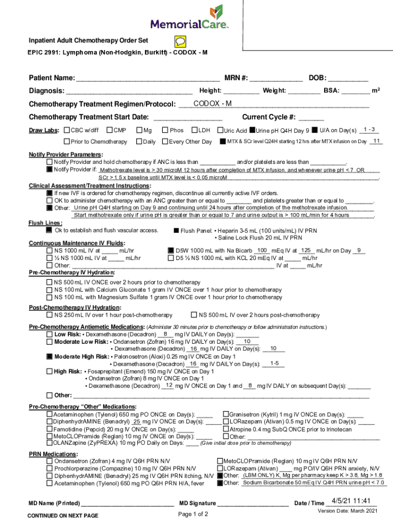 Inpatient Adult Chemotherapy Order Set EPIC 2991: Lymphoma (NonHodgkin, Burkitt) CODEX Patient Name: ___ MAN #: ___ DOB: ___ Diagnosis: ___Height: ___ Weight: ___ BSA: ___ m2CODOX M Chemotherapy Treatment