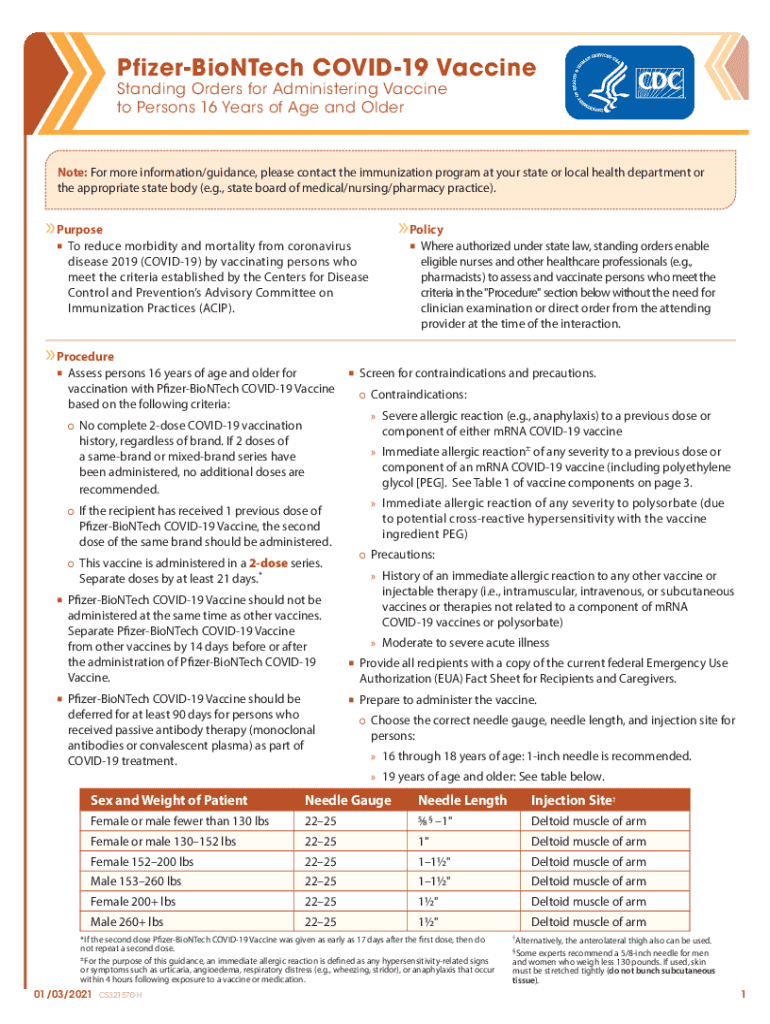 Pfizer BioNTech COVID-19 Vaccine Standing Orders for Administering Vaccine to Persons 16 Years of Age and Alternate: For more information/guidance, please contact the immunization program at your