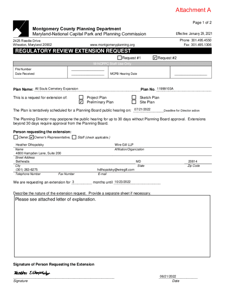 ALL SOULS CEMETERY, 11999103A REGULATORY REVIEW EXTENSION REQUEST NO. 2Description Request to extend the regulatory review period until October 23, 2022; Application to amend the Forest Conservation