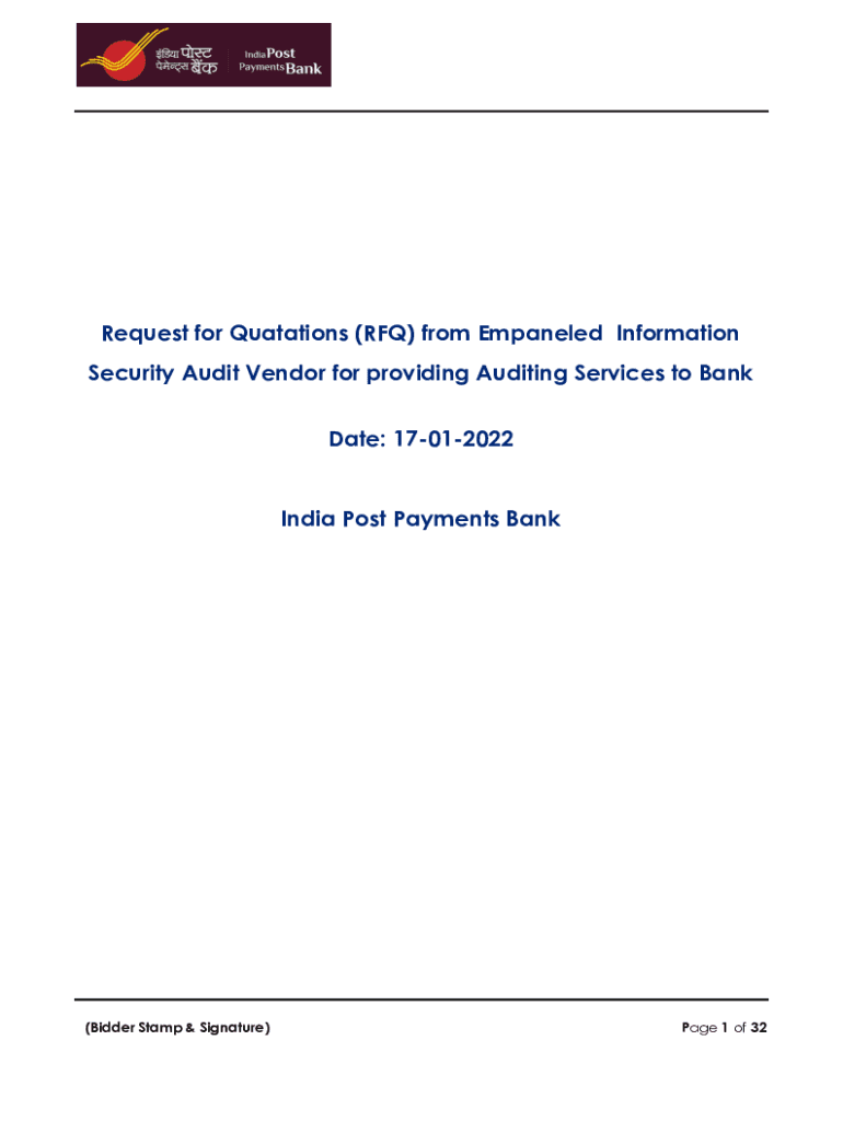 Request for Quotations (RFQ) from Empaneled Information Security Audit Vendor for providing Auditing Services to Bank Date: 17012022India Post Payments Bank(Bidder Stamp & Signature)Page 1 of 32Invitation