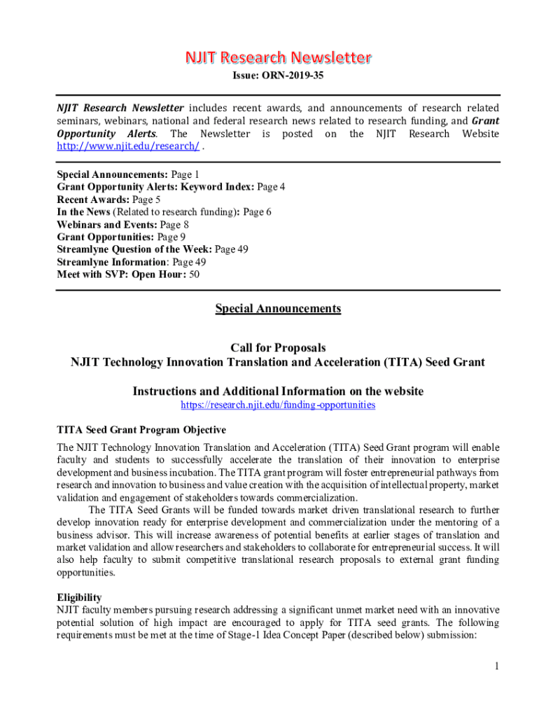Issue: ORN201935 NJITResearchNewsletterincludesrecentawards, andannouncementsofresearchrelatedseminars, webinars, nationalandfederalresearchnewsrelatedtoresearchfunding, andGrantOpportunityAlerts.