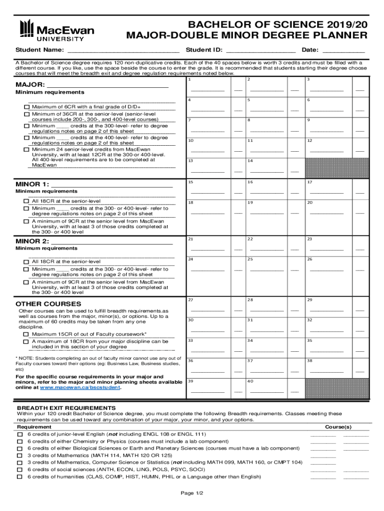 BACHELOR OF SCIENCE 2019/20 MAJORDOUBLE MINOR DEGREE PLANNER Student Name: ___ Student ID: ___ Date: ___ A Bachelor of Science degree requires 120 duplicative credits. Each of the 40 spaces below