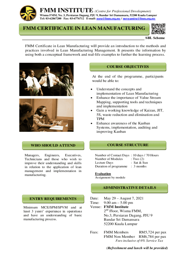 FMM INSTITUTE (Center for Professional Development) Wilma FMM, No. 3, Persia ran Dag ang, PJ 9, Band Sri Mansard, 52200 Kuala Lumpur Tel: 0362867200 Fax: 036776712 Email: nora@fmm.org.my / norsyamira@fmm.org.myFMM