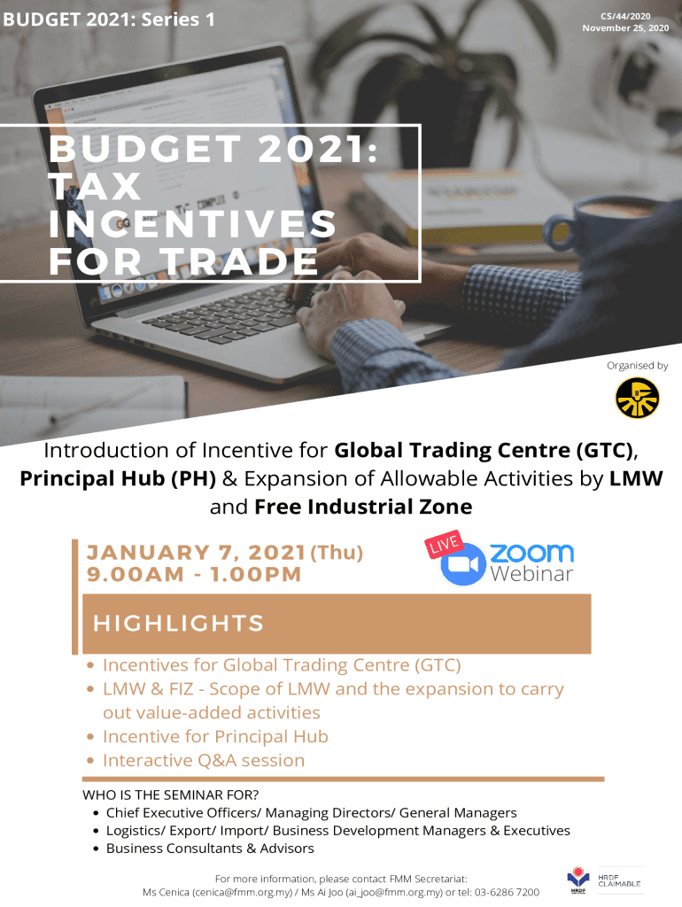BUDGET 2021: Series 1CS/44/2020 November 25, 2020BUDGET 2021: TAX IN C E N T I V ES FOR TRADE Organized introduction of Incentive for Global Trading Center (GTC), Principal Hub (PH) & Expansion of