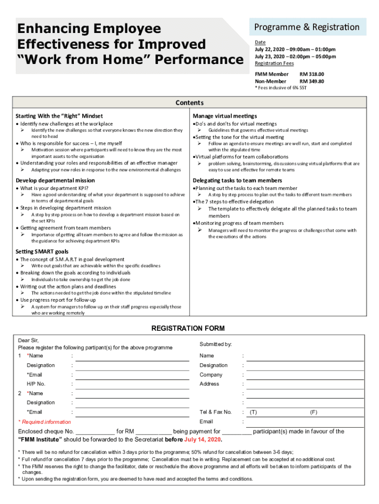 No. 1, Japan Kenyan Mas 1/1, Tehran Business Park III, 81100 Johor Bahru, JohorEnhancing Employee Effectiveness for Improved Work from Home Performance Date July 22, 2020 09:00am 01:00pm July 23,