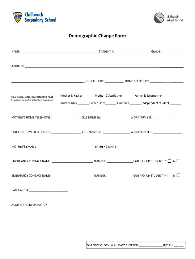 Demographic Change Form NAME: ___ STUDENT #: ___ GRADE: ___ADDRESS:______ POSTAL CODE: ___ HOME TELEPHONE:___LIVING WITH (PleaseStudents Check One): Please Note: Independent must be approved and initialed