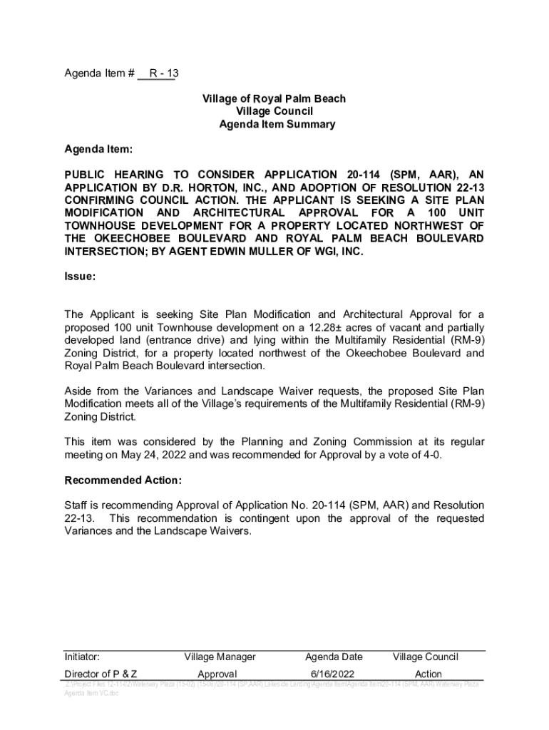Agenda Item #R 13 Village of Royal Palm Beach Village Council Agenda Item SummaryAgenda Item: PUBLIC HEARING TO CONSIDER APPLICATION 20114 (SPM, AAR), AN APPLICATION BY D.R. HORTON, INC., AND ADOPTION