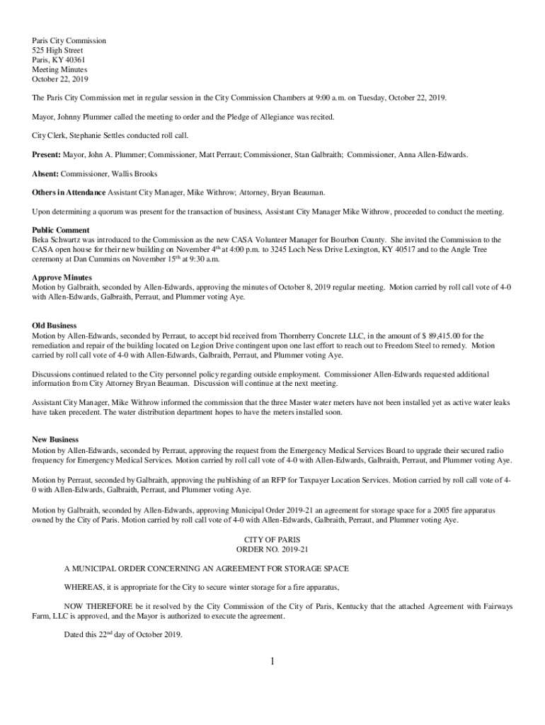Paris City Commission 525 High Street Paris, KY 40361 Meeting Minutes October 22, 2019, The Paris City Commission met in regular session in the City Commission Chambers at 9:00 a.m. on Tuesday, October