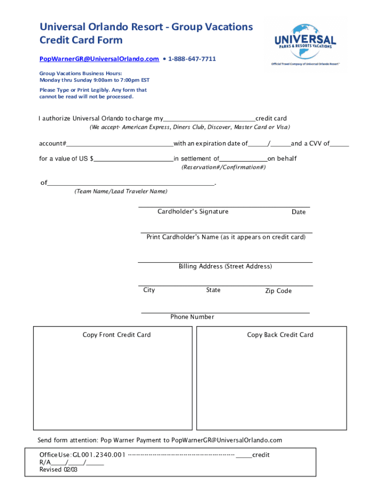 Universal Orlando Resort Group Vacations Credit Card Form PopWarnerGR@UniversalOrlando.com 18886477711 Group Vacations Business Hours: Monday through Sunday 9:00am to 7:00pm EST Please Type or Print