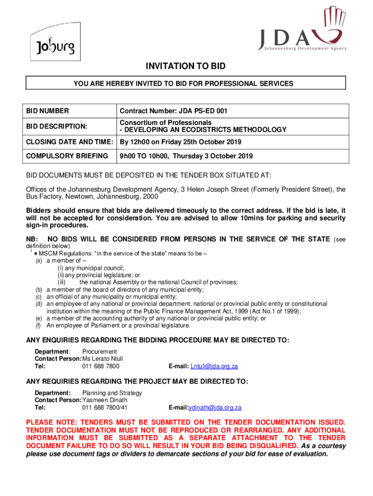 YOU ARE HEREBY INVITED TO BID FOR PROFESSIONAL SERVICES BID NUMBERContract Number: JDA USED 001BID DESCRIPTION:Consortium of Professionals