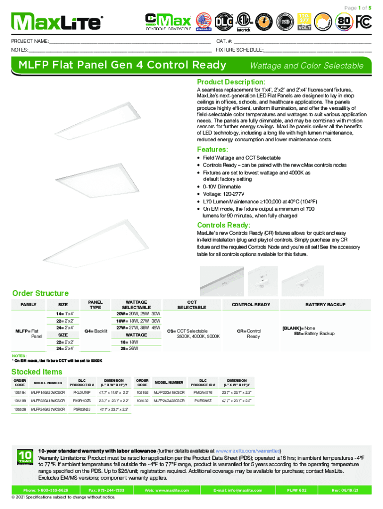 ACAT. #: ___NOTES:___ FIXTURE SCHEDULE:___MLF Flat Panel Gen 4 Control ReadyWattage and Color SelectableProduct Description:A