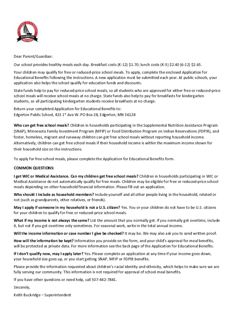Dear Parent/Guardian: Our school provides healthy meals each day. Breakfast costs (K12) $1.70; lunch costs (K5) $2.40 (612) $2.65. Your children may qualify for free or reduced price school meals.