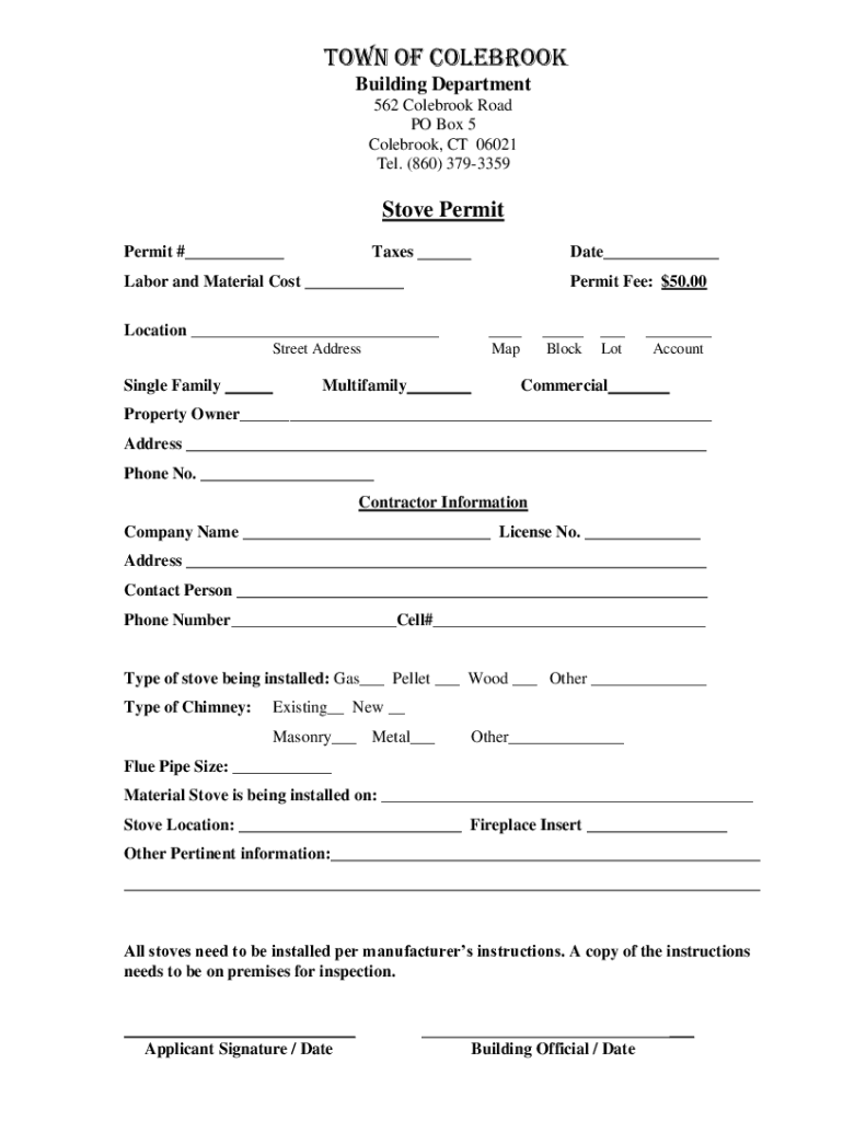 Tel. (860) 3793359Stove Permit #___TaxesDate___Labor and Material Cost ___