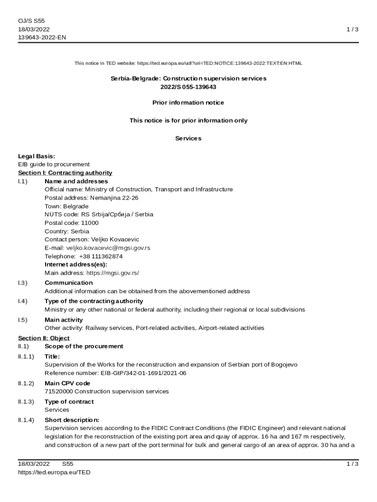OJ/S S55 18/03/2022 1396432022EN1/3This notice in TED website: https://ted.europa.eu/udl?uriTED:NOTICE:1396432022:TEXT:EN:HTMLSerbiaBelgrade: Construction supervision services 2022/S 055139643 Prior