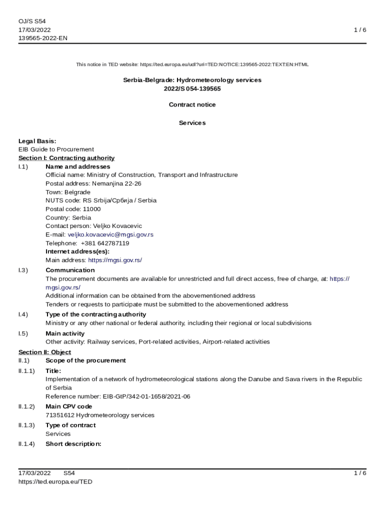 OJ/S S54 17/03/2022 1395652022EN1/6This notice in TED website: https://ted.europa.eu/udl?uriTED:NOTICE:1395652022:TEXT:EN:HTMLSerbiaBelgrade: Hydro meteorology services 2022/S 054139565 Contract notice
